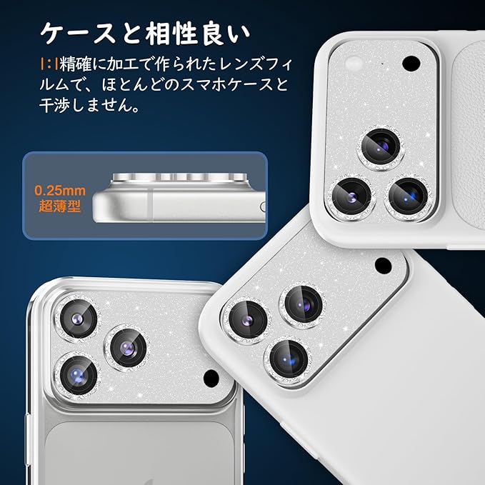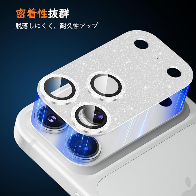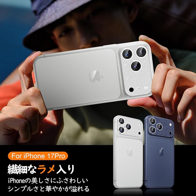 【対応機種】iPhone17 Pro専用カメラフィルム。☆彡守りながら、キラめく☆彡細めのラメの散りばめたレンズカバー、光に反射して派手すぎない絶妙なキラキラ感で、iPhoneにかわいさと繊細さをプラス。表面はフラット加工のため、ラメの剥がれや色褪せがなく、いつも輝き、カバンやポケットから出す際も引っかからず使いやすい。