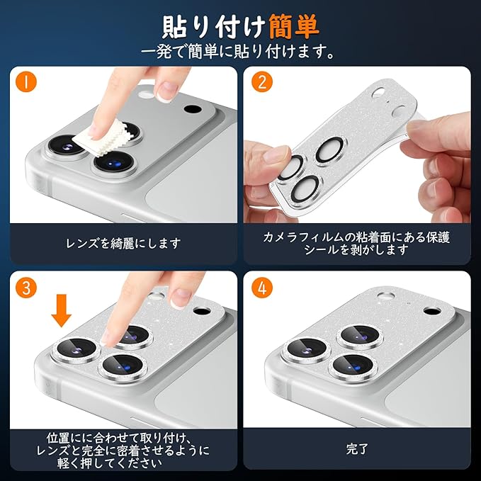カメラカバー iPhone17 Pro用 カメラフィルム キラキラ 9H強化ガラス アルミ合金 耐衝撃 いphone17pro カメラ保護 高透過率 キズ防止 露出オーバー防止 一体化 全面保護 気泡ゼロ 指紋防止 貼り付け簡単 アイフォン17プロ 対応 レンズプロテクター (17Pro,シルバー) | KAZESHOP
