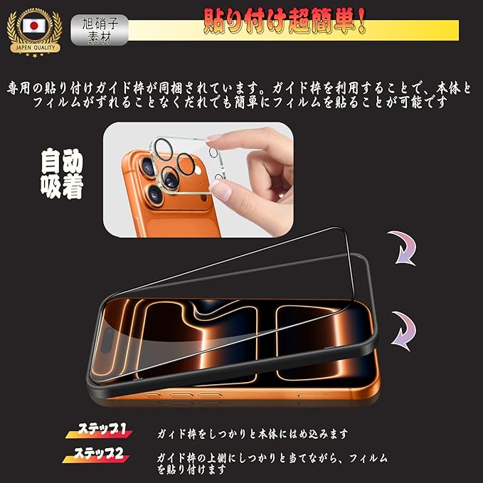 【指紋防止・撥水撥油!貼り付け失敗はゼロ・専用ガイド枠付き】:指紋や汚れに対する特殊ドコーティング済み、普通のガラスより指紋が残りにくく、疎油層と組み合わせ、いつでも美しい画面で滑らかで快適な操作ができます。専用の貼り付けガイド枠が同梱されています。ガイド枠を利用することで、初心者でも簡単に貼り付けます。すべての失敗の発生を防ぐことができて、ご心配を完全に解消します!グレードアップしたイオン自働吸着技術を採用して、初心者でもたった3ステップ、10秒で簡単に綺麗で貼り付けることができます!