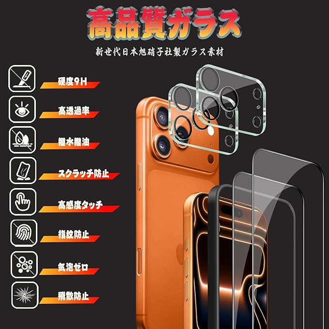 対応 iPhone17Pro ガラスフィルム (2枚) + 17Pro カメラ保護フィルム (2枚) ガイド枠付 旭硝子製素材 硬度9H 強化黒縁 高光沢 貼り付け簡単 撥水撥油 自動吸着 気泡防止 指紋防止 飛散防止 スクラッチ防止 対応 アイフォン17Pro レンズフィルム + 17Pro フィルム | KAZESHOP