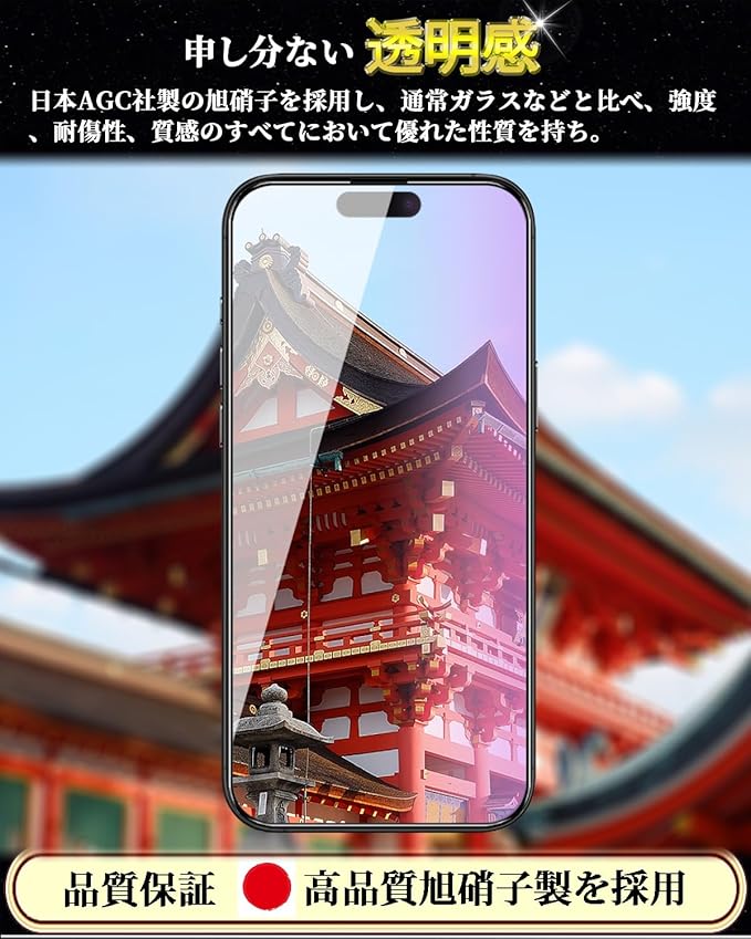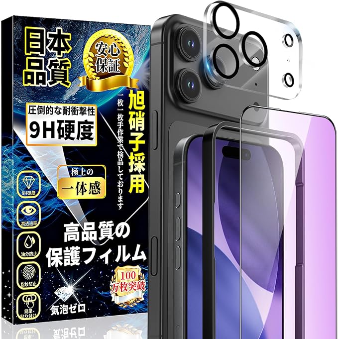 【旭硝子素材採用!対応機種】iPhone 17Pro 1枚ガラスフィルム+1枚カメラフィルム。日本製最上級旭硝子ガラスを使用しております、業界最高レベルの9H硬度、ハードコーティング技術により外部からの衝撃をフィルムが吸収し、ナイフや鍵などの尖ったものでも簡単には傷がつかなく、最高程度で画面を守ります。