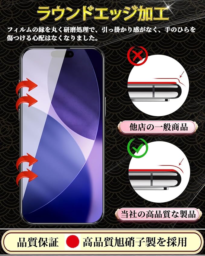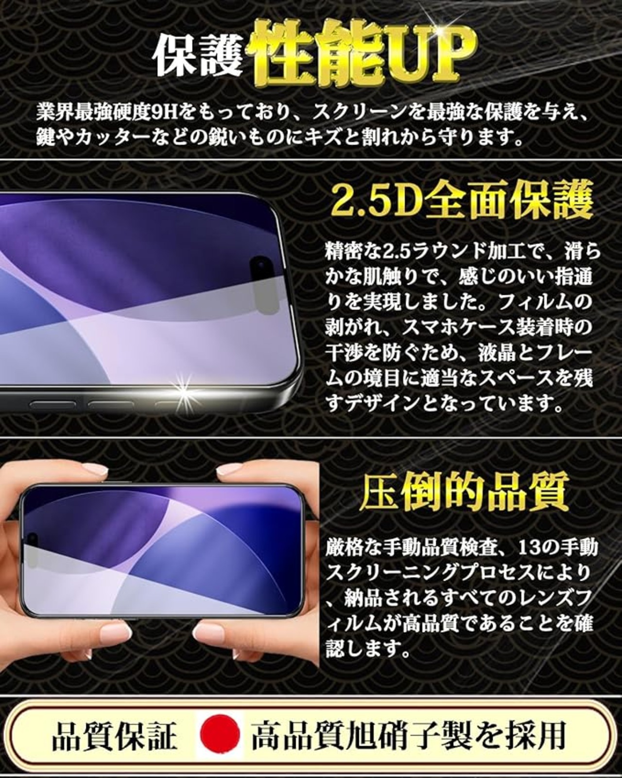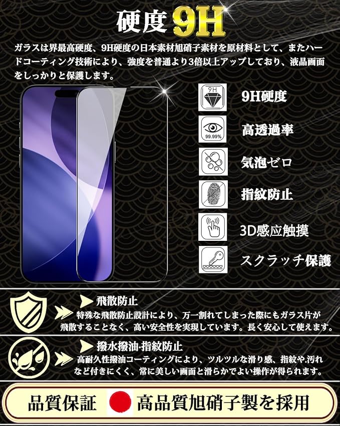 特徴 全面保護,9H表面硬度,飛散防止,防指紋,撥油コーティング,撥水剤,耐衝撃性,ラウンドエッジ,気泡なし,高透過率,簡単貼り付け