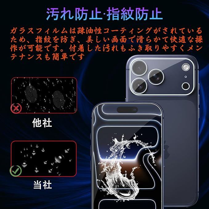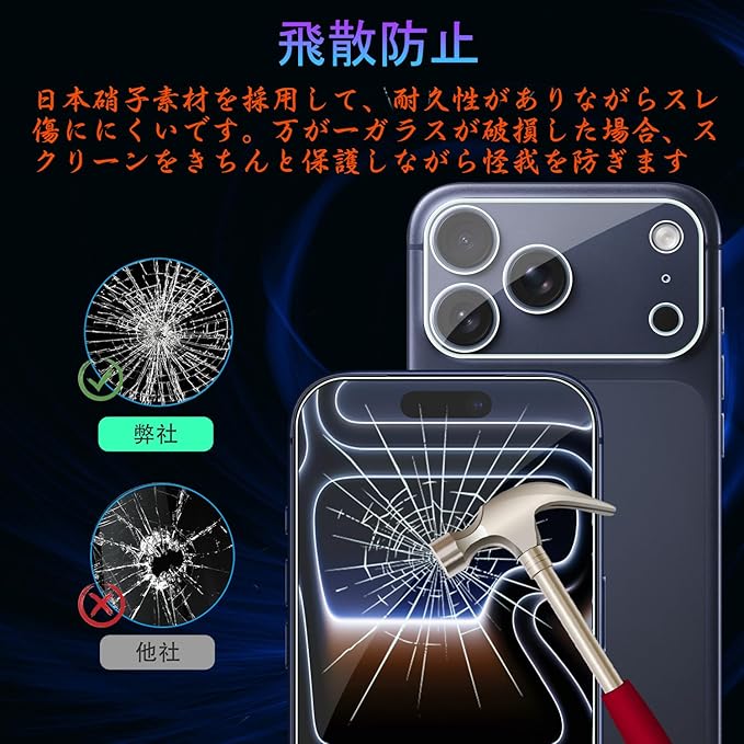 【対応機種】:iPhone 17 Pro Max ガラスフィルム (2枚) + iPhone 17 Pro Max カメラフィルム (2枚) ※<<安心保証>> 商品が届いた後、輸送中に破損したり、数が合わない場合がございましたら、お気軽に弊社までご連絡くださいませ。お客様からのお問い合わせ内容に応じて代替品交換・返金対応を提供致します。
