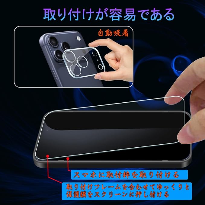 【貼付け簡単・専用ガイド枠付き】専用の貼り付けガイド枠が同梱されています。ガイド枠を利用することで、初心者でも簡単に貼り付けます。すべての失敗の発生を防ぐことができて、ご心配を完全に解消します!グレードアップしたイオン自働吸着技術を採用して、初心者でもたった3ステップ、10秒で簡単に綺麗で貼り付けることができます。
