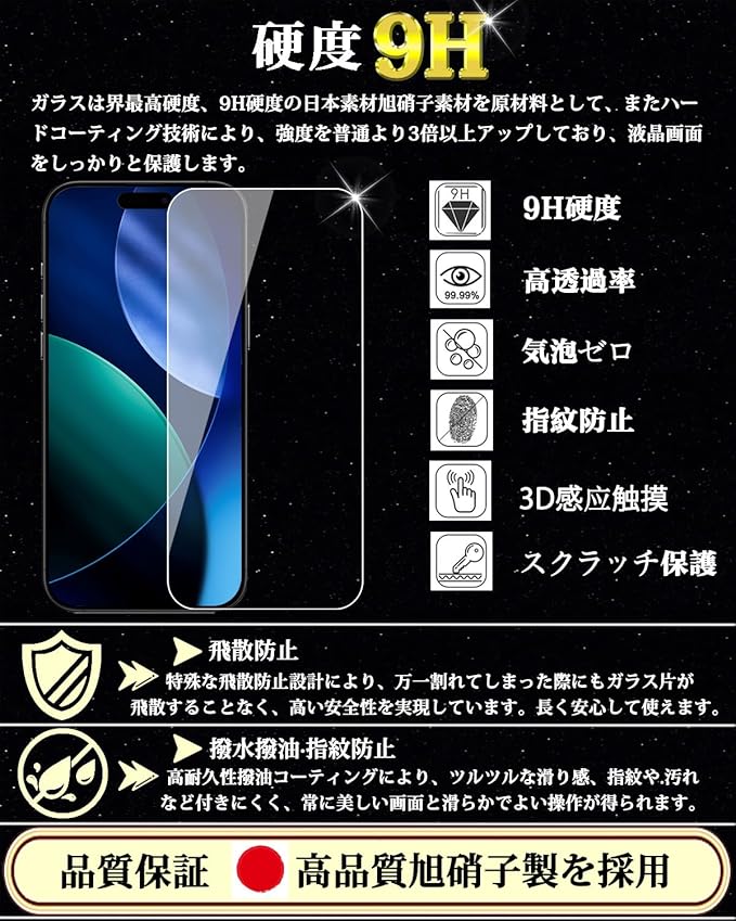 特徴 全面保護,9H表面硬度,飛散防止,防指紋,撥油コーティング,撥水剤,耐衝撃性,ラウンドエッジ,気泡なし,高透過率,簡単貼り付け