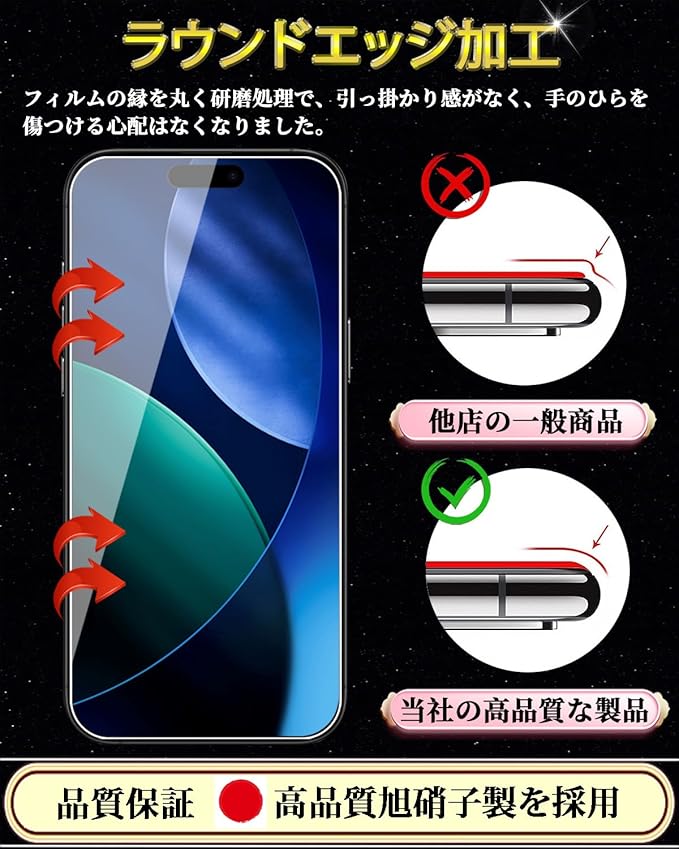 【旭硝子素材採用】日本製素材旭硝子製を採用しております、高品質な素材で衝撃を緩和し画面の破損を最低限まで抑えます。高品質製品の製作プロセスに厳しく基づき、ガラス420 高温強化時間6時間、め七つのステップを経てスマホに完璧的にフィットした製品を製造されます。