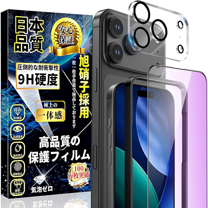 【旭硝子素材採用!対応機種】iPhone 17Pro Max 1枚ガラスフィルム+1枚カメラフィルム。日本製最上級旭硝子ガラスを使用しております、業界最高レベルの9H硬度、ハードコーティング技術により外部からの衝撃をフィルムが吸収し、ナイフや鍵などの尖ったものでも簡単には傷がつかなく、最高程度で画面を守ります。