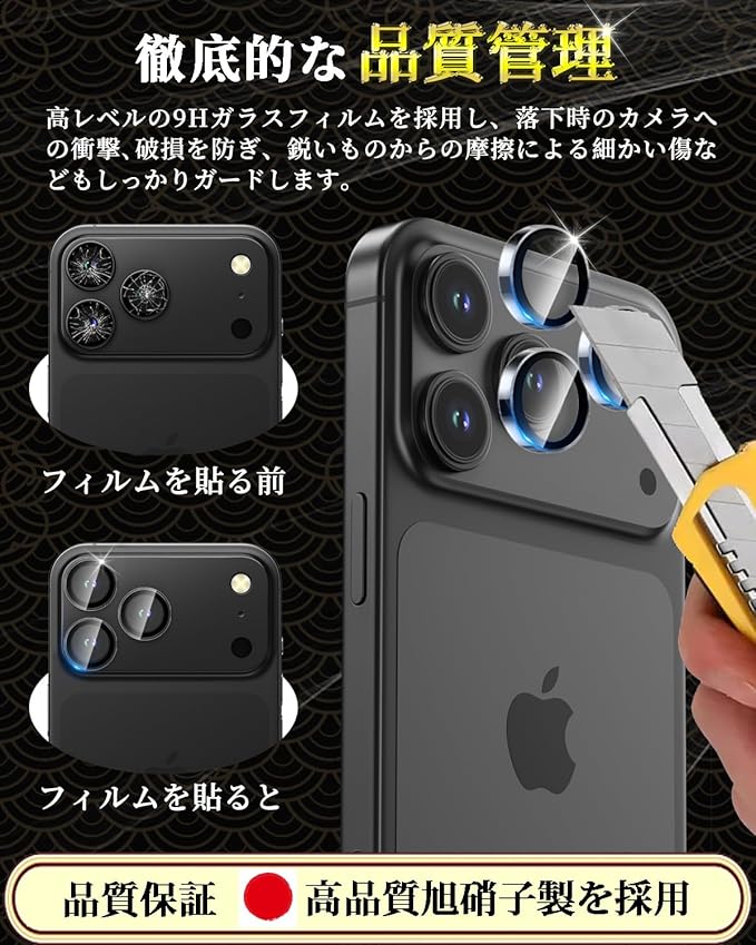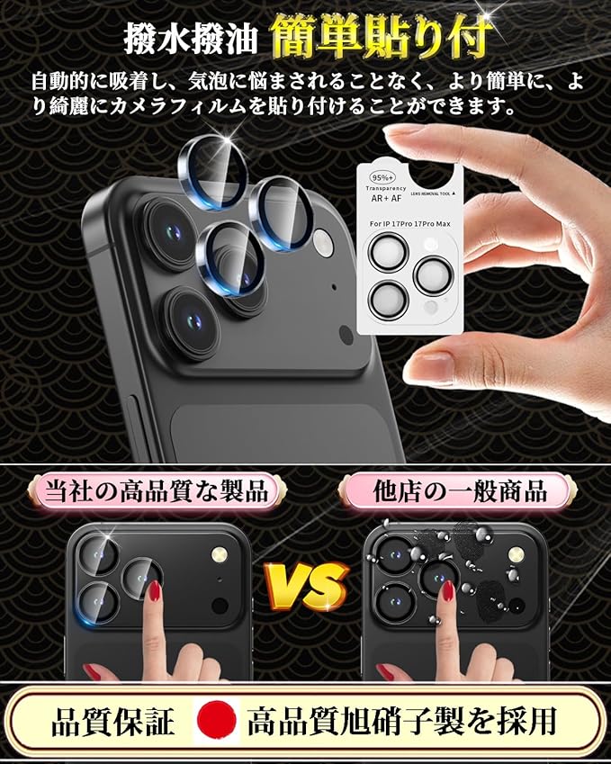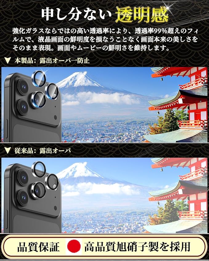 【専用設計!対応機種】iPhone 17 Pro / 17 Pro Max 専用 カメラフィルム 露出オーバー防止。精密加工により、透明なアクリルリングとガラスで、レンズに溶け込むような一体感。カメラ保護フィルムは、貼り付けてもカメラレンズより0.26mmほどしか高くならないため、カメラレンズそのままで使っているような自然なデザインです。