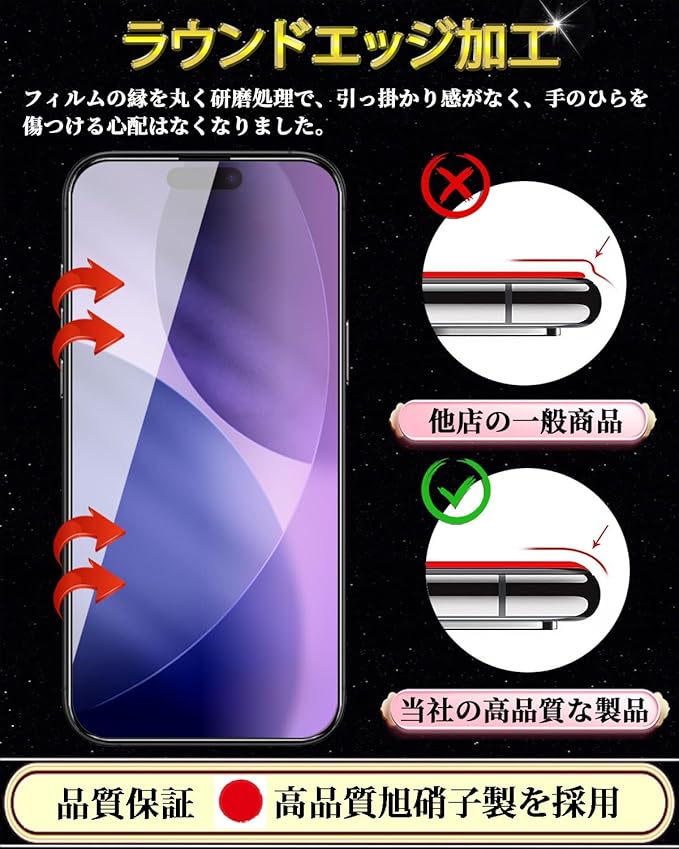 特徴 ブルーライトカット,9H表面硬度,飛散防止,防指紋,撥油コーティング,撥水剤,耐衝撃性,ラウンドエッジ,気泡なし,高透過率,簡単貼り付け