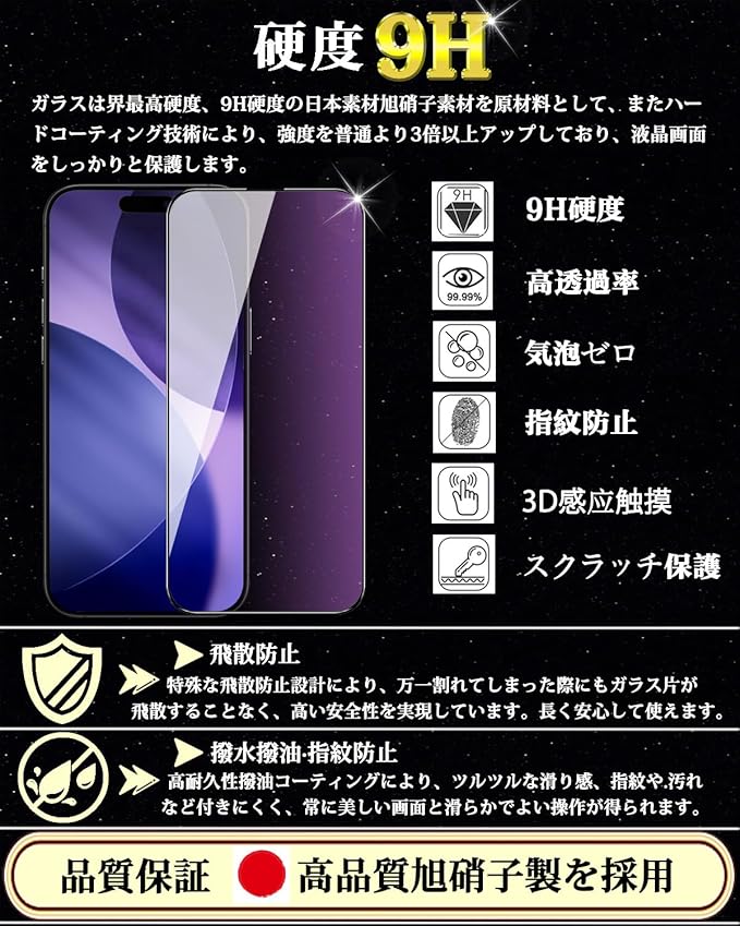【旭硝子素材採用!対応機種】iPhone 17 Pro ブルーライトカット ガラスフィルム。日本製最上級旭硝子ガラスを使用しております、業界最高レベルの9H硬度、ハードコーティング技術により外部からの衝撃をフィルムが吸収し、ナイフや鍵などの尖ったものでも簡単には傷がつかなく、最高程度で画面を守ります。