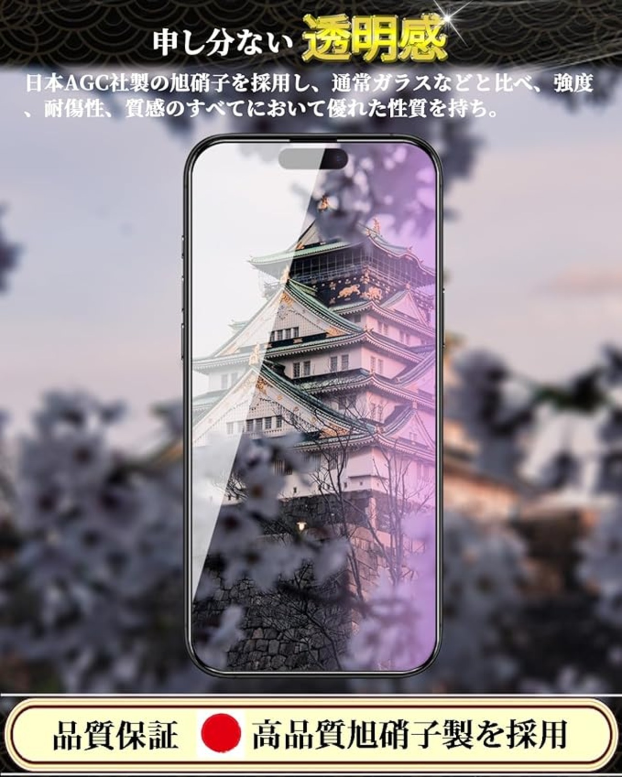 【旭硝子素材採用!対応機種】iPhone 17 Pro 強化ガラスフィルムは日本製の旭硝子を素材として採用し、業界最高レベルの9H硬度を持ち、耐衝撃性と耐傷性に優れています。衝撃吸収の特性により、転落とかの外力からスマホ画面への衝撃ダメージを最小限に抑えることができます。