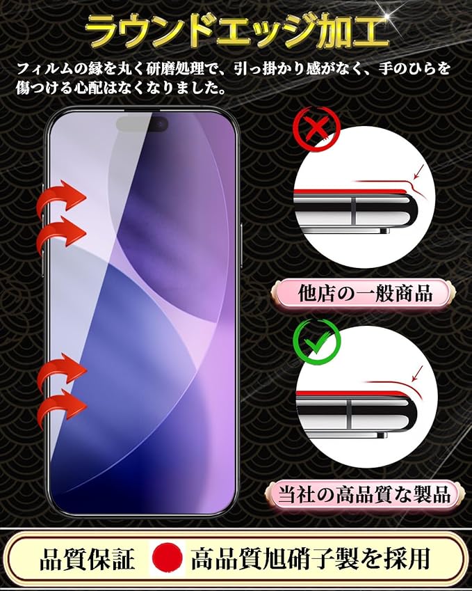 特徴 ブルーライトカット,9H表面硬度,飛散防止,防指紋,撥油コーティング,撥水剤,耐衝撃性,ラウンドエッジ,気泡なし,高透過率,簡単貼り付け