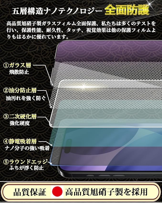 【気泡ゼロ・貼付け簡単】気泡防止加工が施されているので、気泡が入りにくい。万が一気泡が入ってしまっても時間が経てば徐々に抜けるので 美しい仕上がりに。自動吸着機能あり、ガラスを液晶画面スクリーンに軽く押すだけで自然に画面に吸着できます。初心者やフィルム貼りが苦手の方にも安心です。