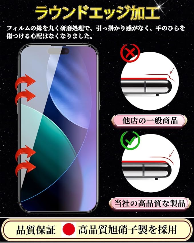 特徴 ブルーライトカット,9H表面硬度,飛散防止,防指紋,撥油コーティング,撥水剤,耐衝撃性,ラウンドエッジ,気泡なし,高透過率,簡単貼り付け