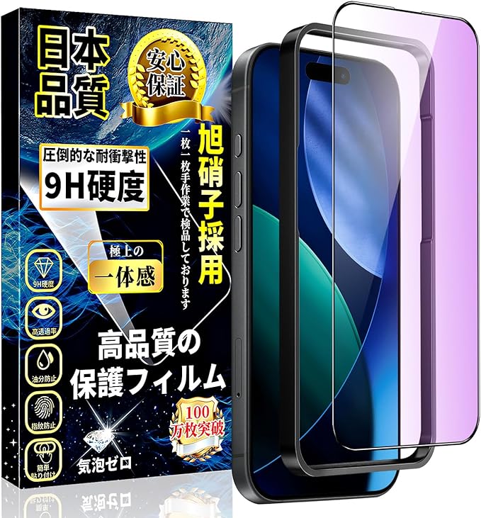 【旭硝子素材採用!対応機種】iPhone 17 Pro Max ブルーライトカット ガラスフィルム。日本製最上級旭硝子ガラスを使用しております、業界最高レベルの9H硬度、ハードコーティング技術により外部からの衝撃をフィルムが吸収し、ナイフや鍵などの尖ったものでも簡単には傷がつかなく、最高程度で画面を守ります。