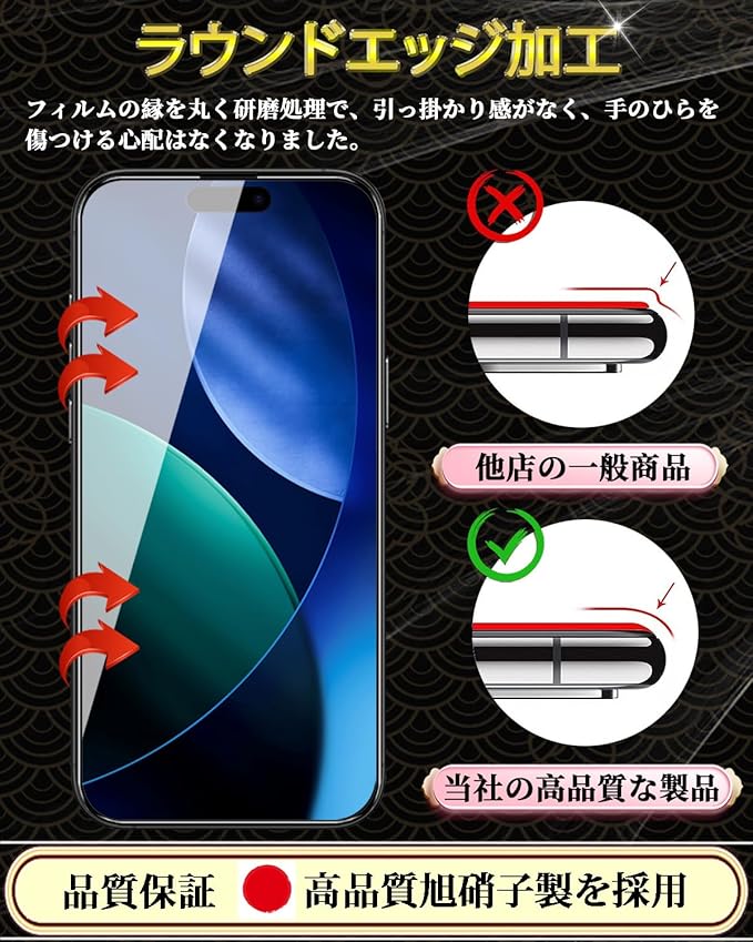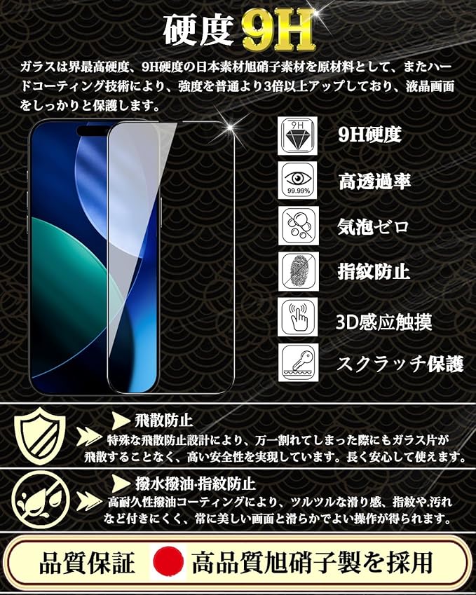 特徴 全面保護,9H表面硬度,飛散防止,防指紋,撥油コーティング,撥水剤,耐衝撃性,ラウンドエッジ,気泡なし,高透過率,簡単貼り付け