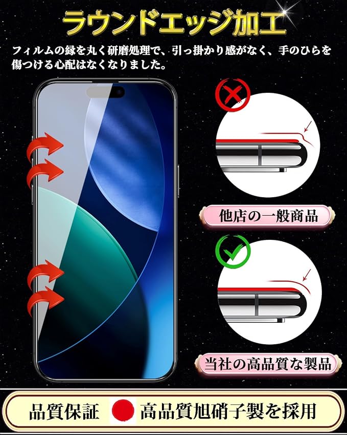 特徴 全面保護,9H表面硬度,飛散防止,防指紋,撥油コーティング,撥水剤,耐衝撃性,ラウンドエッジ,気泡なし,高透過率,簡単貼り付け