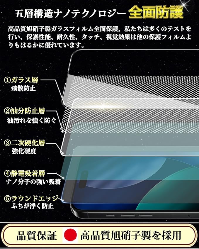 【旭硝子素材採用】日本製素材旭硝子製を採用しております、高品質な素材で衝撃を緩和し画面の破損を最低限まで抑えます。高品質製品の製作プロセスに厳しく基づき、ガラス420 高温強化時間6時間、め七つのステップを経てスマホに完璧的にフィットした製品を製造されます。
