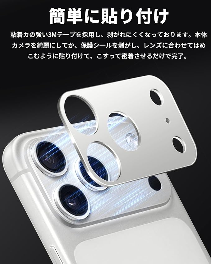 【貼り付け簡単】粘着力の強い3Mテープを採用しており、アイホン17 pro 本体カメラを綺麗にしてから、保護シールを剥がし、レンズに合わせてはめこむように貼り付けて、しっかりとこすって密着させるだけで完了。また、嵌め込み式であるため、より剥がれにくくなっています。