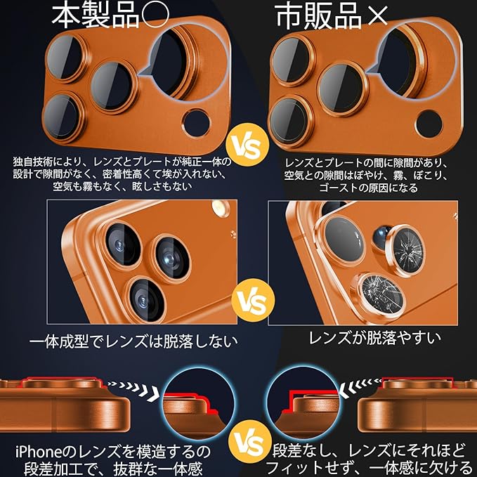 【対応機種】 iPhone17Pro専用カメラ保護カバーで、カメラレンズを全面保護します。独自技術により、レンズとプレートが純正一体の設計で隙間がなく、密着性が高くて埃が入れない、空気も霧もなく、眩しさもない。レンズは脱落することがありません。