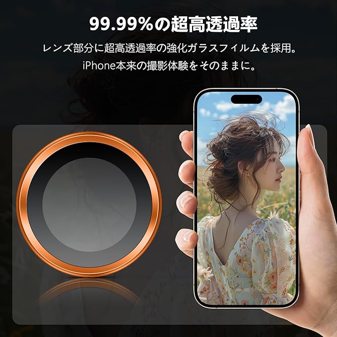 [高精細クリア]レンズプロテクターのレンズ部分は高透明度の強化ガラスを使用し、超薄型(0.3mm)で99%の光学透過率を実現。紫外線を効果的に遮断・濾過します。さらに強化ガラス表面には反射防止コーティングを施し、指紋・汗・ホコリの付着を防ぎ、iPhone本来の優れた撮影能力を損なわず、写真や動画の品質を忠実に再現します。