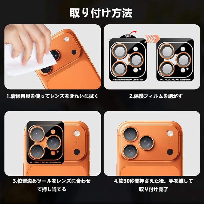 [簡単取り付け]パッケージ内容:カメラプロテクターカバー 1、取り付け位置決め治具 1、クリーニングキット 1。取り付け時は、まずクリーニングキットでレンズをきれいに拭き取り、位置決め治具でレンズ位置に正確に合わせて置き、30数秒間押さえるだけでしっかり固定されます。ナノ静電自動吸着技術採用で気泡が入らず、剥がれにくい設計です。ご不明な点がございましたらお気軽にお問い合わせください。24時間以内にご返信いたします。