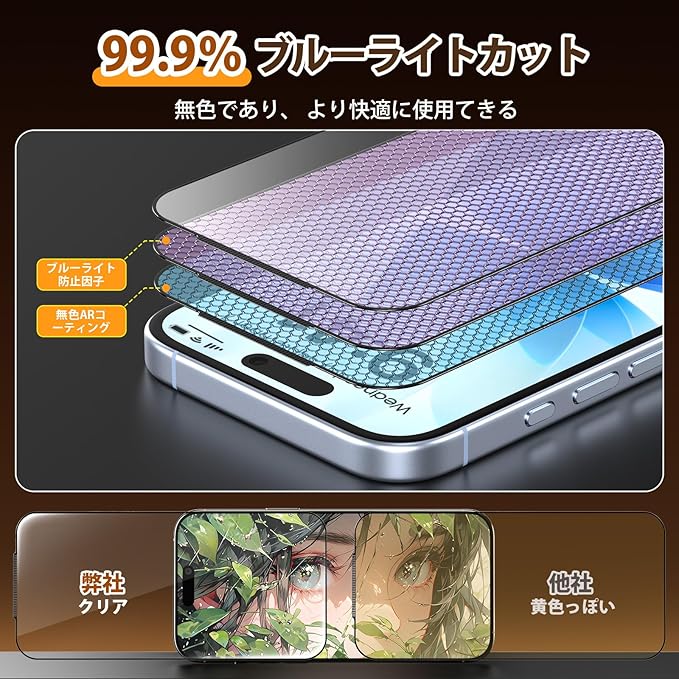 【画期的な技術・99.9%ブルーライトカット】ガラスフィルム基材にブルーライト防止因子を加え、有害なブルーライトを吸収することでブルーライトを遮断し、持続的なブルーライトによる目へのダメージを軽減します。また、iphone17 フィルムにドイツで開発されたARコーティングを施し、有害なブルーライトを反射させます。「吸収」+「反射」の2つのカット方式で99.9%ブルーライトカットを実現しました。