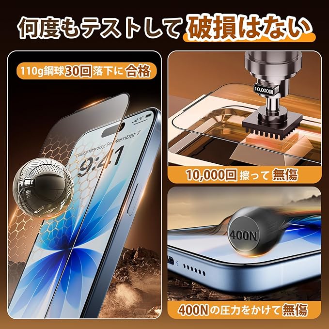 【何度もテストして破損はない】いPhone17のガラスフィルムは、さまざまな厳しいテストをクリアしています。エッジに400Nの圧力をかけても無傷であり、360cmの高さから110gの鋼球を30回落下させても破損しません。さらに、スチールウールで10,000回擦っても傷がつかないことが証明されています。これらのテスト結果から、非常に高い耐久性と耐衝撃性を持つことが保証されています。