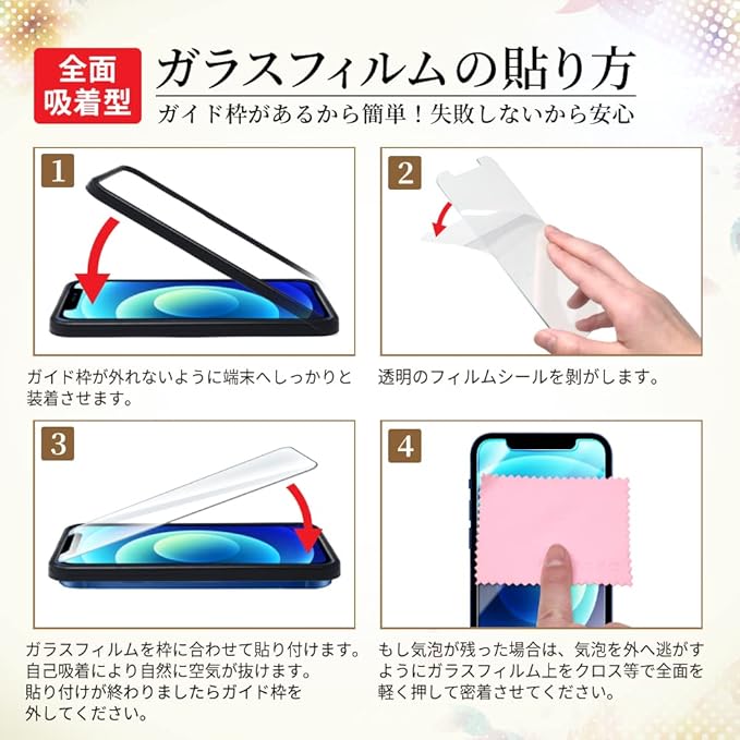 【叶kanaeスマホケースと相性保証】弊社販売のスマホケースと干渉しないように専用設計されています。※本商品は全面吸着型で、フィルム全体が画面に接着するタイプです。貼り付けが簡単になる専用ガイド枠を付属。