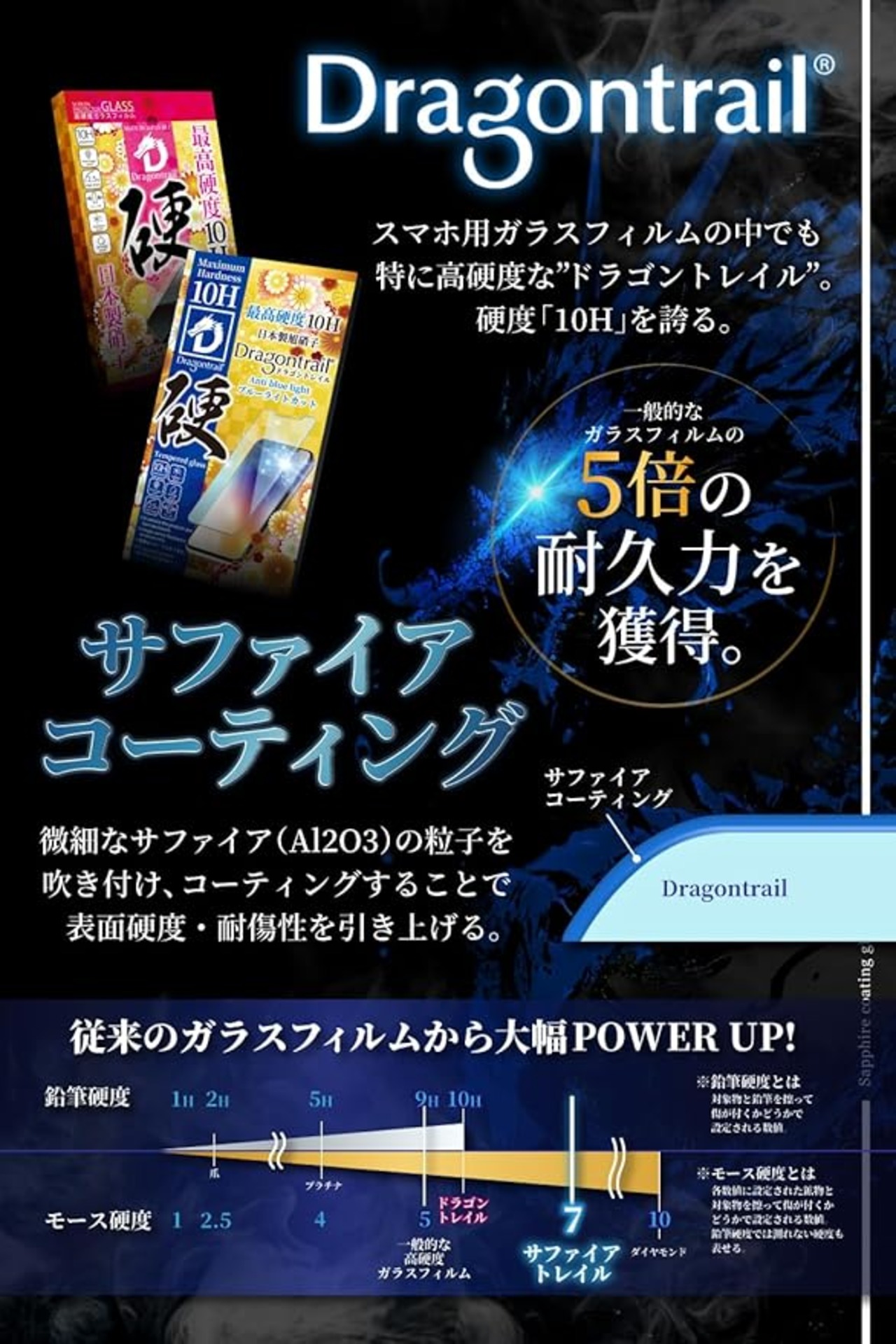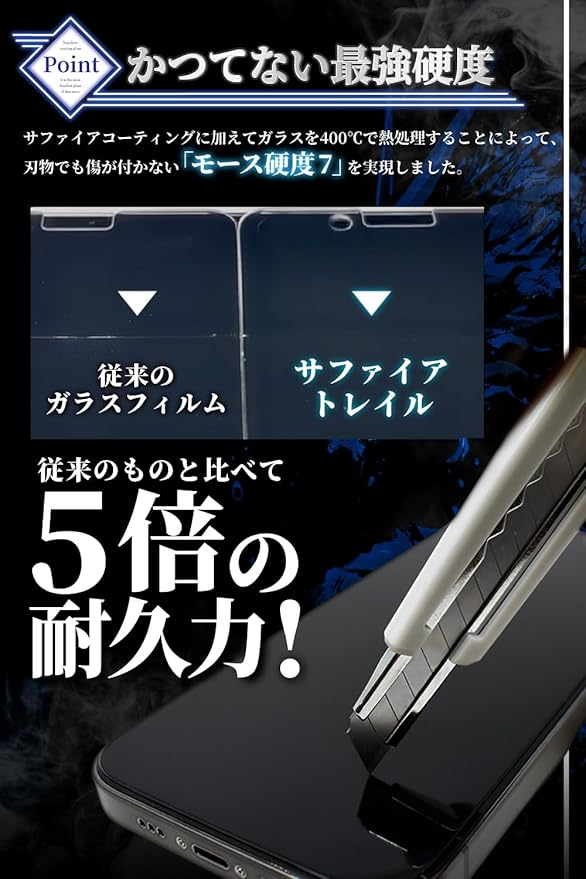 【一般的なガラスフィルムの5倍の耐久力】高硬度なドラゴントレイルにサファイアコーティングをすることで表面硬度・耐傷性を引き上げる