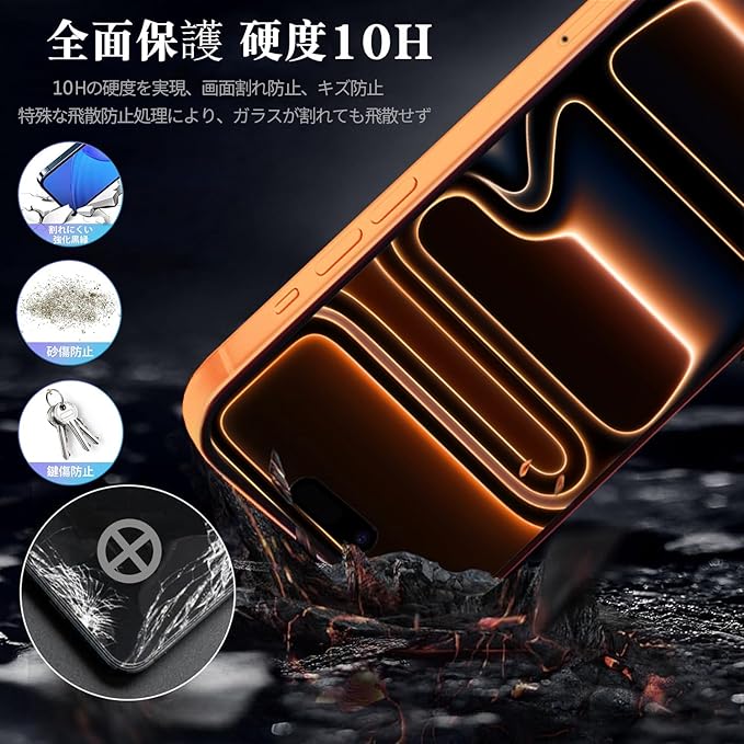 ★【高品質素材製、日本旭硝子製】一般的なガラス保護フィルムよりも耐久性に優れたハードコーティング技術により、10Hの硬度を実現。特殊な飛散防止処理により、ガラスが割れても飛散せず、破片が付着したときに携帯電話の画面を傷から安全に保護できる。DZHFUのいphone液晶保護フィルム 一般的な製品に比べ3倍以上の保護力があり。