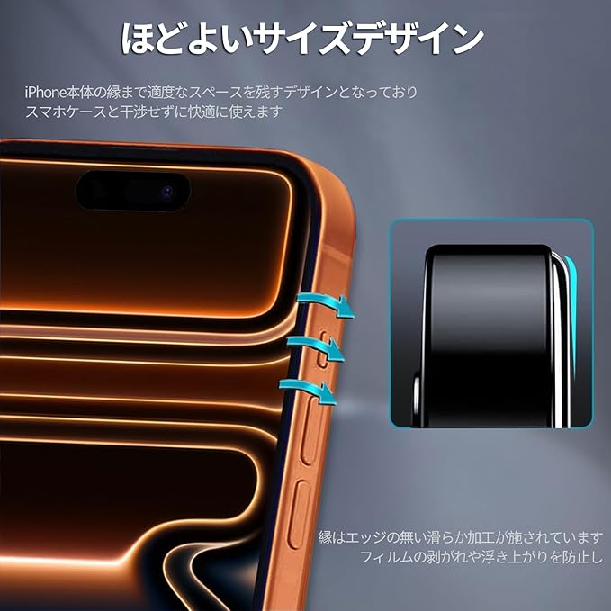 ★【ほどよいサイズデザイン】縁はエッジの無い滑らか加工が施されています、iPhone17Pro本体の縁まで適度なスペースを残すデザインとなっており、フィルムの剥がれや浮き上がりを防止し、スマホケースと干渉せずに快適に使えます。