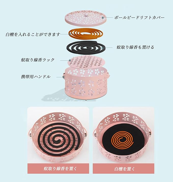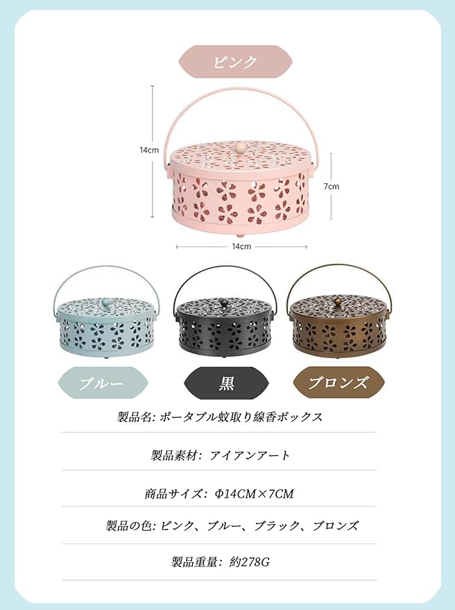 【製品仕様】丸型蚊取り線香ホルダー、直径14cm、高さ7cm、内径14cm。花型の穴により通気性が良く、スタンドが不要なので、蚊取り線香を直接上に置くこともできます。