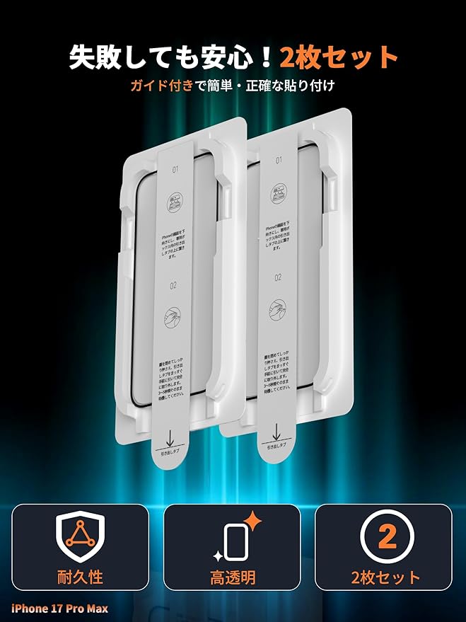 【プロ級簡単貼り!専用ガイド枠付き】自社開発の「ラクラク貼りキット」を採用。面倒な位置合わせは一切不要です。枠にiPhone 17をセットし、タブを引き出すだけで、自動吸着技術が驚くほど気泡ゼロ・ズレゼロの完美な貼り付けを実現。進化した静電気除塵シートがホコリを自動吸着するため、初心者の方でもプロのような仕上がりを簡単に再現できます。貼り失敗のストレスと交換コストから解放されます。