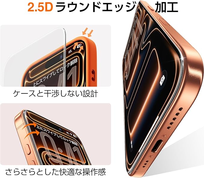 【色透過率100%・無類の一体感】2.5Dラージアークエッジデザインにより、手を傷つける危険性がなくて、どの角度からでも優しくて滑らかな手触りを提供いたします!死角がなくジャストフィットのスクリーン保護があり、黒い端なしでフルスクリーンにマッチし、100%スマホケースに対応し、ケースと干渉がなく完璧です!最新光学ガラス技術を通じて、無色透明で、ほぼ100%の透過率を達成します!0.3mmの薄みで機敏なタッチ反応と見えない保護を両立し、ゲームと文字入力がスムーズに途切れず、抜群のタッチ感があります。臨場感があふれる超クリアな画質を取り戻し、画像ロスがゼロで、クリアなiPhone17 Pro のオリジナル画面体験を満喫します!