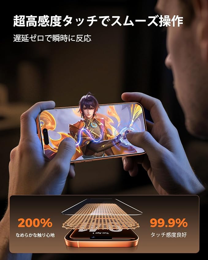 高透過率・超薄設計:厚さわずか0.01インチの超薄型ガラスは99.9%の高い透過率を実現し、画面の鮮明さや色彩を損なわず、滑らかで自然なタッチ感を保ち、スマホ本来の美しさを守りながら快適に操作できます。