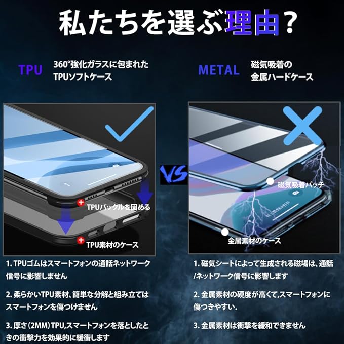 【精選した材質】前面9H強化ガラス+背面透過率99.9%PC素材はスマートフォンを保護し、タッチ感度に影響しません. 金属やマグネットを使用しない高弾性TPUにはスマートフォンの通話信号を全然影響しません。