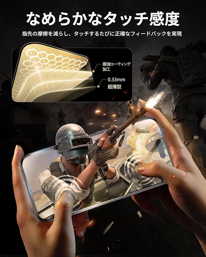 「超高透過率・高感度タッチ」厚さ0.33mmの超薄型で、透過率抜群です。驚くほど高い透明度を誇っており、画面の鮮明さや美しさを損なわずにあいふぉん17本来の美しい画面をお楽しみいただけます。画面上の操作も違和感なくスムーズに行えます。