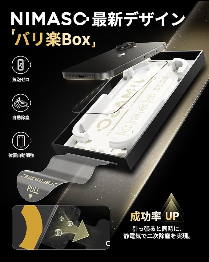 「驚くほど簡単!2ステップでズレなし貼り付け」NIMASO最新デザインのバリ楽Boxさえあれば、簡単に貼り付けができます。バリ楽Boxには正確な位置決め装置が搭載されており、アイフォン17の画面にぴったり合うようにフィルムが配置されています。これにより、いPhone17のスクリーンを下に向けた状態でボックス中に入れて引っ張るだけで、誰でも簡単に、位置ズレなく完璧にフィルムを装着できます。