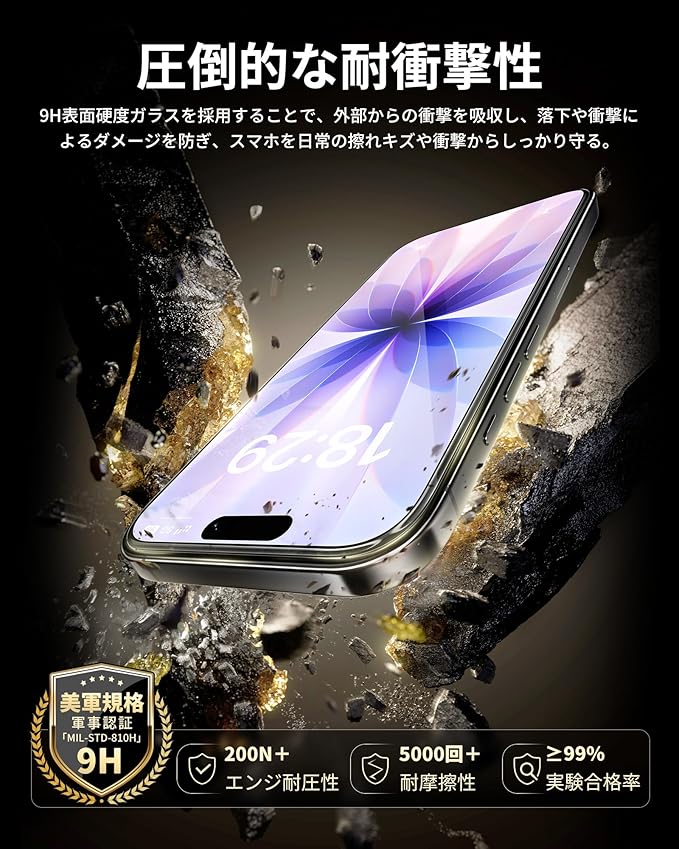 「9H硬度・飛散防止」米軍規格「MIL-STD-810H」に準拠(認証番号SZXEC23002005001)。9H硬度のガラスを採用。小刀や鍵などの鋭いものにぶつかっても傷が付きにくく、いpほね17をしっかり保護します。飛散防止加工により、万一割れてもガラス破片が飛び散ることなく安心です。