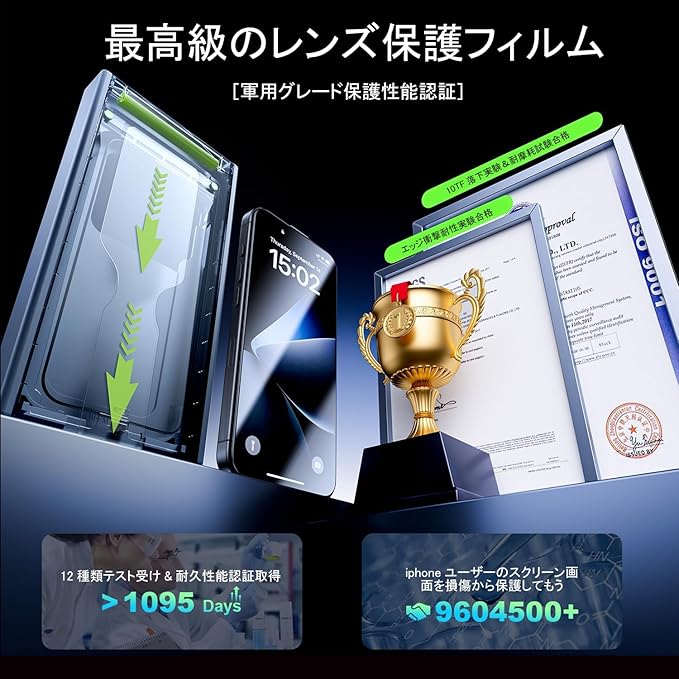 【9H硬度強化・飛散防止】対応 いphone17pro 保護フィルムは画面に全面保護を提供します。航空宇宙や軍事分野で広く使用されている業界最先端の 9H+ 強化ガラスを採用し、4.5時間以上の高温クエンチ処理を受け、通常のガラスよりも5倍高い125MPaの圧強度を持っています。 衝撃性と耐摩耗性に優れ、落下や衝撃を恐れない。しかも衝撃を抑えるシリコンコーティングを内蔵し、画面の破損を最低限まで抑え、すり傷防止や指紋防止をしながらiPhoneを最大限に守ります。鍵やコインなどの鋭利な物と一緒にカバンに入れて猛烈に揺れても傷がつきません。万が一割れた時も飛散防止加工により怪我を効果的に防ぎ、使用者の安全を確保します。
