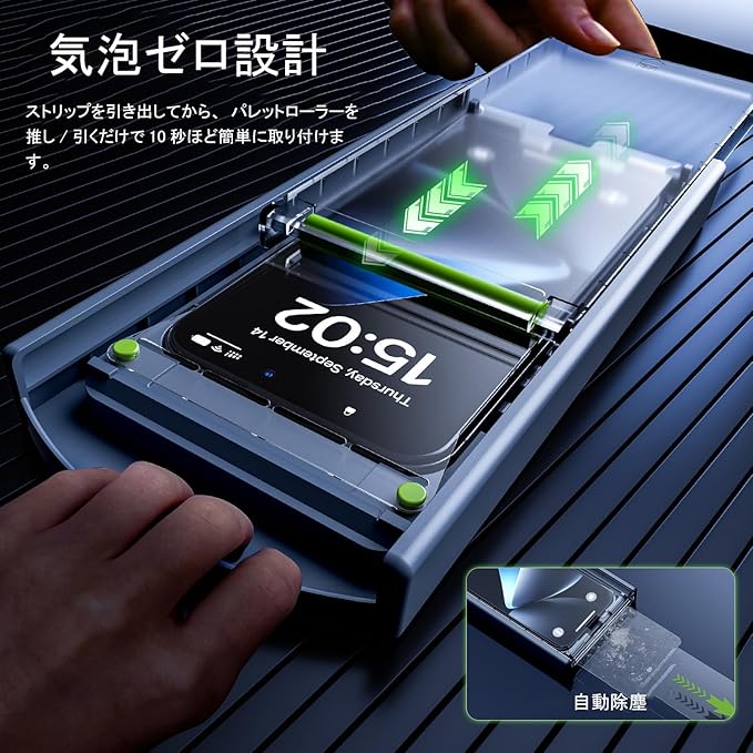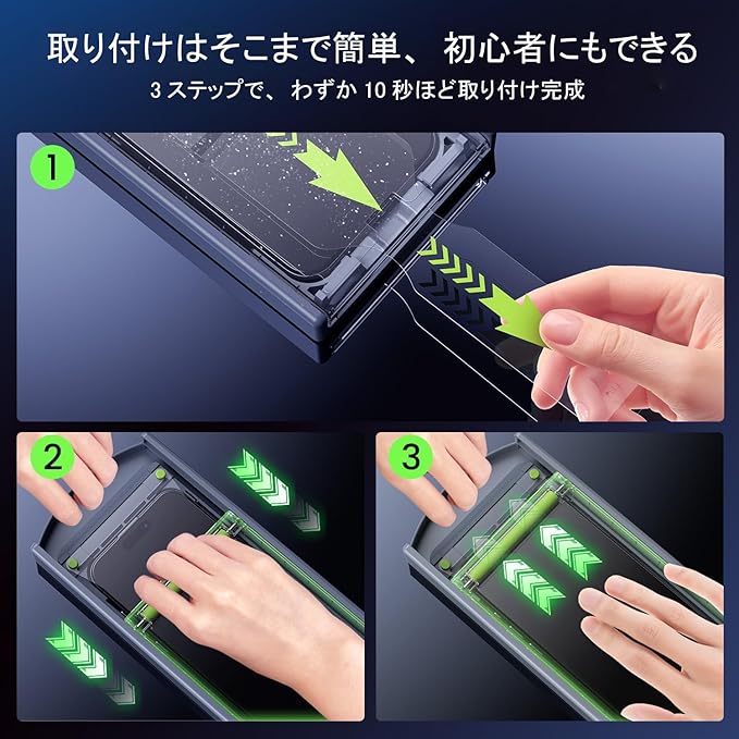 【パレットローラーボックス・簡単に取り付け】重複使用可能の独特なパレットローラー式ガイドボックス、簡単に推す/引くだけでご利用いただけます。精密な位置合わせツール、コツ不要、気泡ゼロの取り付け設計。マジックアライメントキットを使えば、いpほね17 pro ガラスフィルムを10秒ほどインストールできて、精確な位置合わせとホコリ100%除去を一気に完了します。ナノコーティング技術を採用したため、吸着層をたった1秒で気泡も浮きもなく、画面に溶け込んでいくように完璧に貼れます。仮に気泡が出てきたとしても、ちょっとした押すだけで消えてしまいます! 手先が苦手な人でも簡単に取り付けられます!正式に取り付けを始める前に、取扱説明書やインストールビデオをご覧ください。