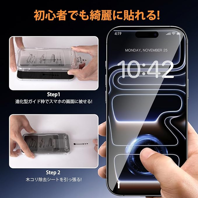 【超安心なガイド枠!自動除塵・気泡ゼロ】対応 あいふおん 17 Pro フィルムは最新型の自動除塵ガイド枠を採用し、貼り付けが驚くほど簡単に。スマホ画面にフレームを置き、除尘シートを引くだけの2ステップで完了。スマホフィルムも自然と吸着する構造になっているため、静電気を利用してスクリーン上のホコリが引き出せ、気泡が入りにくく、完璧な貼り付けが可能。気泡は自動的に排除され、キレイに貼れるバブルなしの画面を手軽に楽しめます。