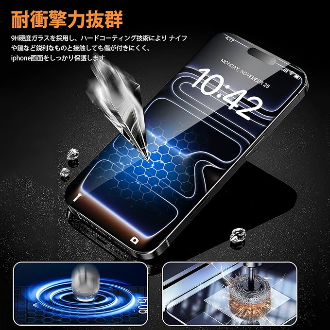 【10H硬度・飛散防止】対応 アイフォン 17 プロ ガラスフィルムは10H硬度の強化ガラスを採用。ナイフや鍵などの鋭利な物品と接触しても傷つきにくく、画面を強力に守ります。また、スマホ画面保護フィルムは特殊な飛散防止設計により、万が一割れても破片が飛散せず、安全性が極めて高いのも特長です。スマホの画面保護とユーザーの安全を両立しました。