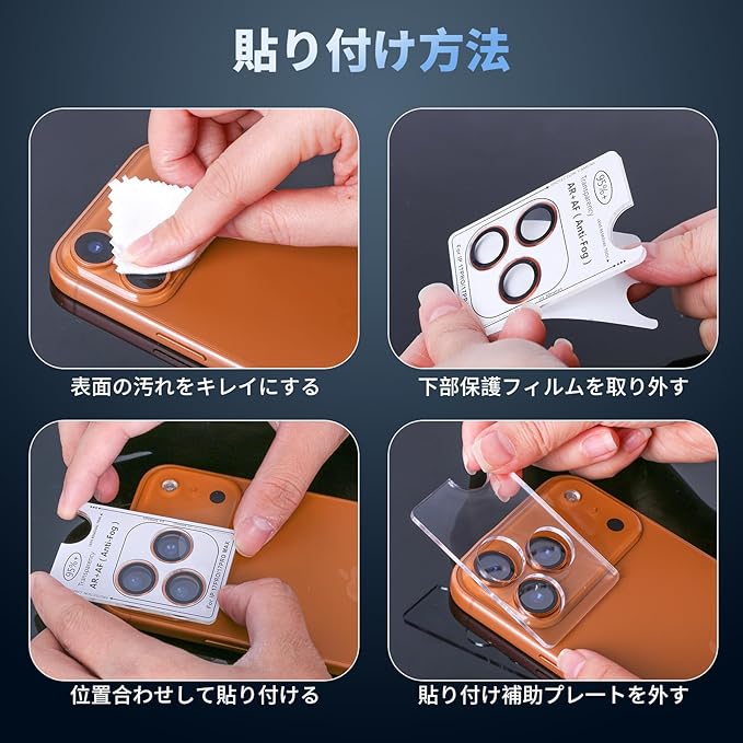 【対応機種】対応 iPhone 17 Pro / 17 Pro Max カメラ保護フィルム。パッケージ内容:カメラフィルム 2 、画面清掃ツール 2セット、マニュアル。