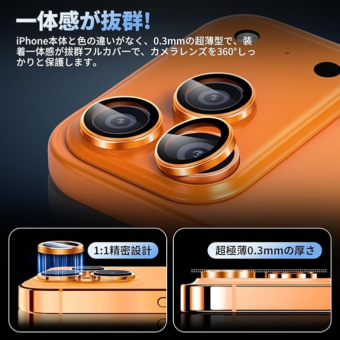 対応 iPhone 17 Pro / 17 Pro Max カメラ保護 カメラ保護カバー アルミ合金+強化ガラス製 カメラフィルム 曇り防止 高透過率 黒縁取り 露出オーバー防止 指紋防止 自動吸着 気泡ゼロ 対応 いphone 17 Pro / 17 Pro Max レンズカバー 【2枚セット】(コズミックオレンジ) | KAZESHOP