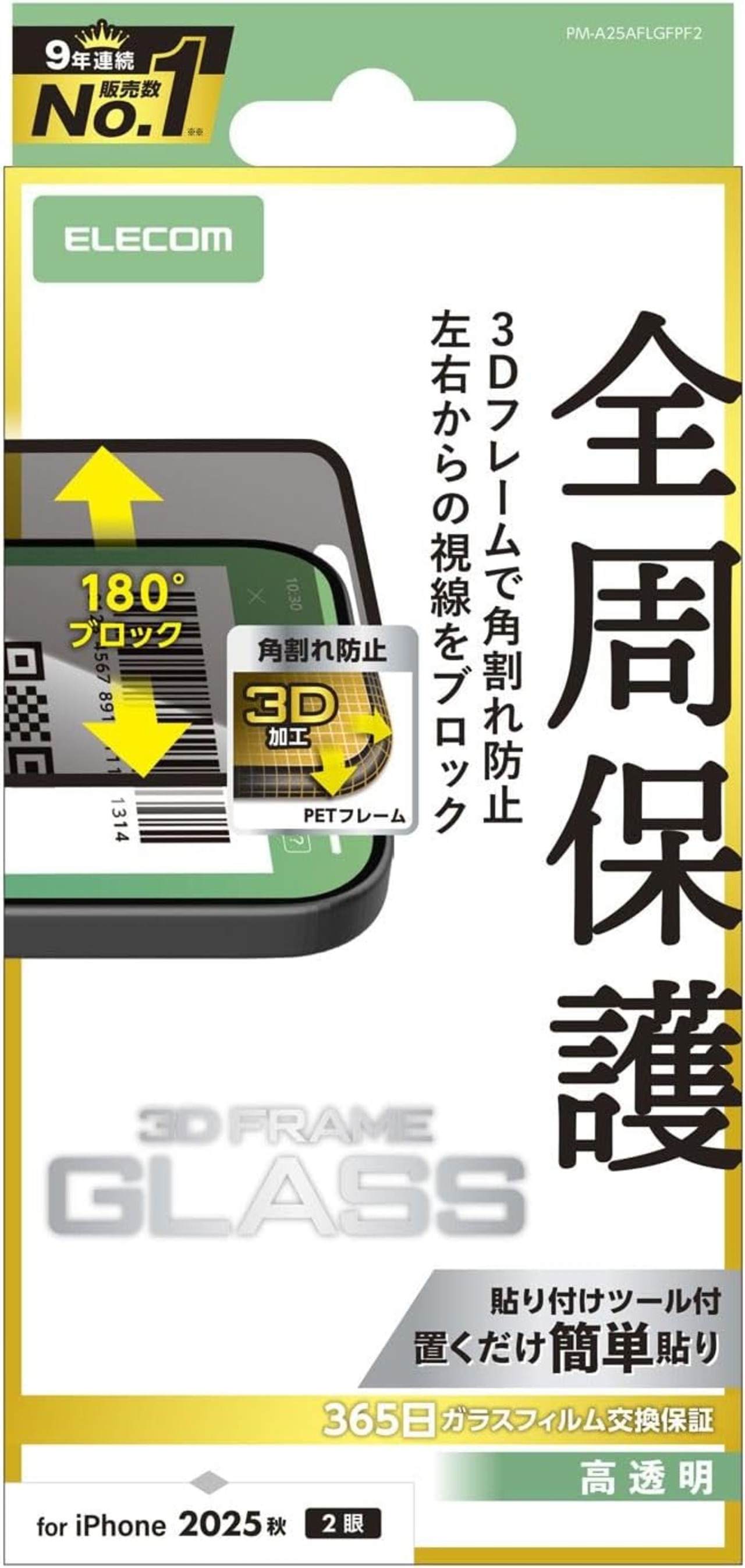 エレコム iPhone 17 ガラスフィルム のぞき見防止 左右 強化ガラス 硬度10H フレーム付き 角割れしない 3Dフレーム 指紋がつかない 気泡が入らない 【貼り付けツール付き】 [365日交換保証付き] PM-A25AFLGFPF2 | KAZESHOP