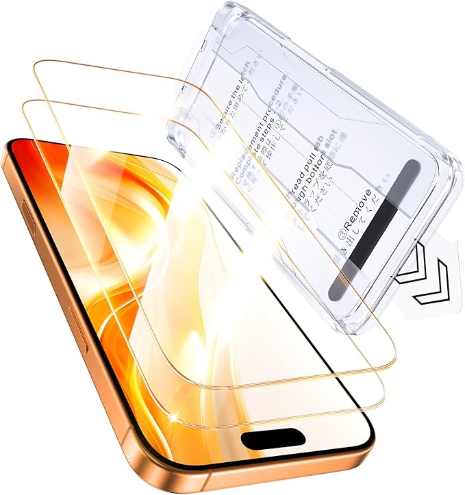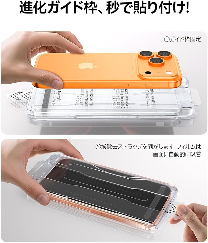 【貼付け失敗しない】本製品はiPhone17pro に対応するガラスフィルム2枚セットです。新進化自動吸着式ガイド枠を使って、3歩だけで保護フィルムを貼り付けます。そのうえ、自動ホコリ取りデザインだけでなく、ガイド枠のスロープデザインで、空気を順序に取り除くことができて、初心者でも気泡レスのまま綺麗に貼れます。