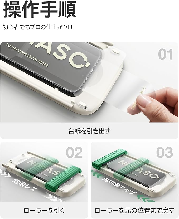 「一発で完璧に貼りつけ・気泡レス」:従来のフィルム貼りに伴うストレスをすべて解消した、今までの概念を超えたガイド枠が登場しました。スライドローラー式ガイド枠がiphone 17proにぴったり合わせて完全フィット、面倒な位置調整は不要、初めての方でも一発でピタッと正確に貼り付けることができます。フィルムをセットし、ローラーで押して引き戻すだけの簡単操作、スライドローラーにより、気泡が少なくなります。誰でもプロ並みの完璧な貼り付けが可能になりました。