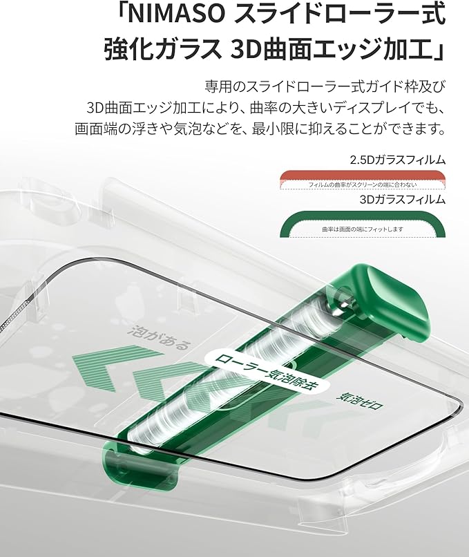 「バリ楽Roller」NIMASO ガラスフィルム iPhone 17 Pro用 スライドローラー式 強化ガラス 3D曲面エッジ加工 全面保護 黒縁あり 防塵メッシュ 指紋防止 貼付け簡単 保護フィルム 自動除塵 ガイド枠付き 1枚セット いPhone 17 pro(6.3インチ)対応 DSP25F1697 | KAZESHOP